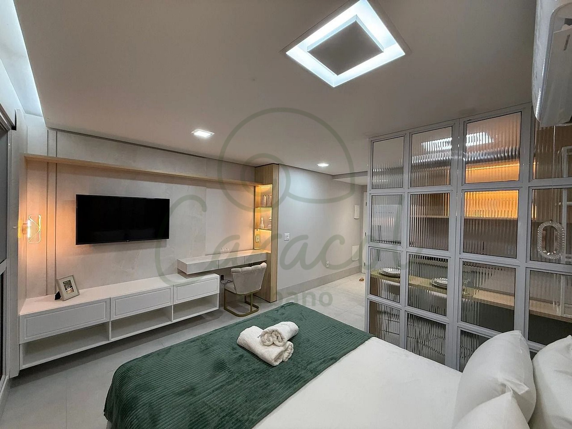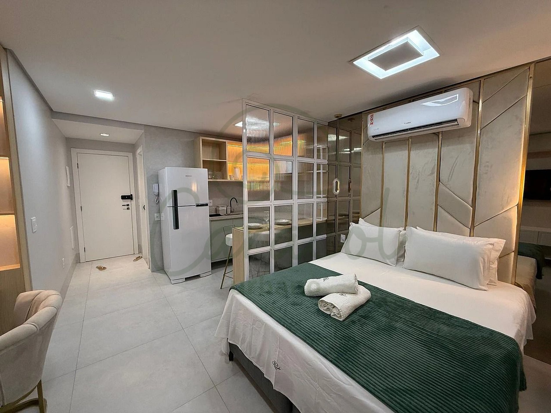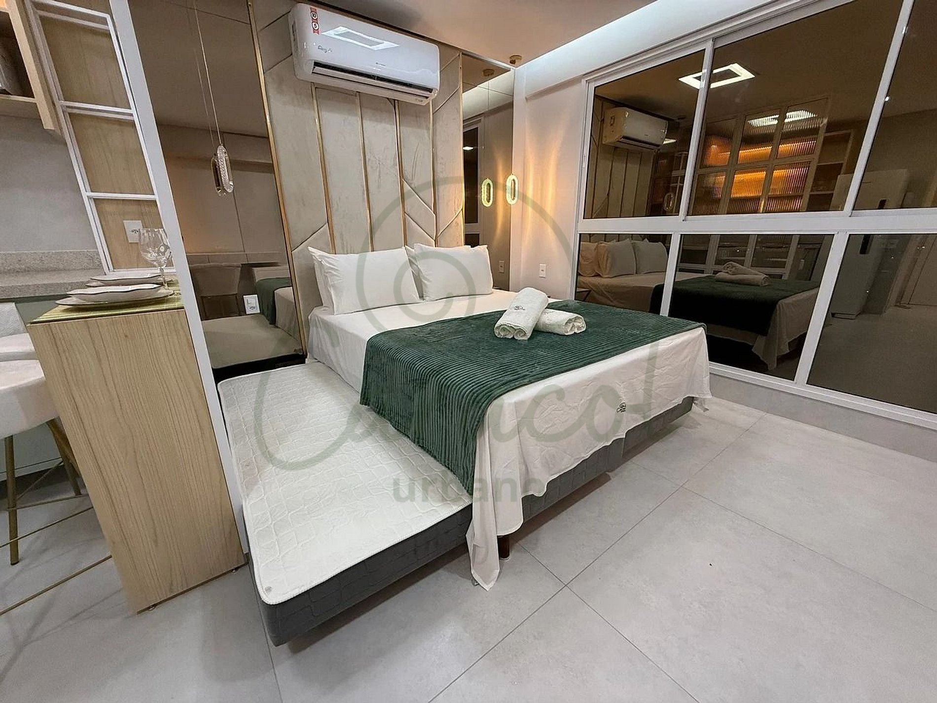 O Golden Studio é especial porque combina luxo e funcionalidade em um ambiente único e sofisticado. Sua arquitetura com detalhes dourados transmite uma elegância incomparável, enquanto as comodidades modernas, como ar-condicionado, Wi-Fi rápido e cozinha equipada, garantem conforto absoluto. O edifício City House eleva ainda mais a experiência com uma piscina de borda infinita deslumbrante, mercado 24h e portaria 24h, criando o equilíbrio perfeito entre requinte e praticidade. É mais do que uma estadia; é uma experiência inesquecível.